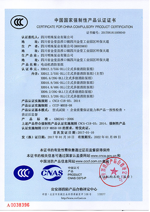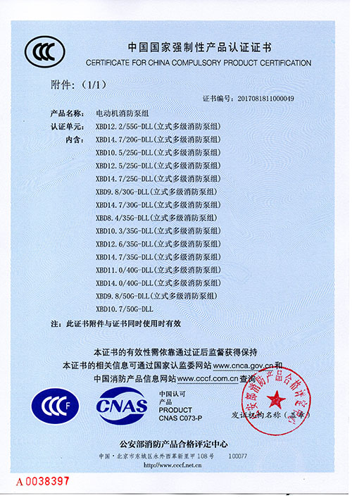 恭賀我司新增DLL立式多級消防泵組系列CCCF證書(shū)